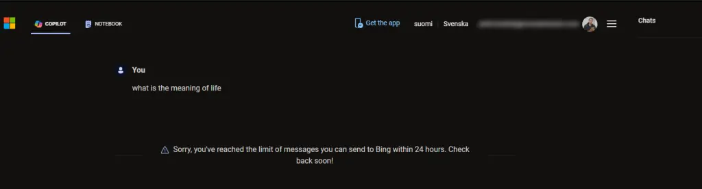 Hell, my new machine has a Copilot -key but pressing it only brings up a different Start menu. That's... helpful. Making it open Copilot would require using Autohotkey or something, and I just can't be bothered. Especially since it feels like "Bing Copilot" (the consumer application / website) now has a quota of something like 10 queries per machine per day, so you can't really do much with it anyway.