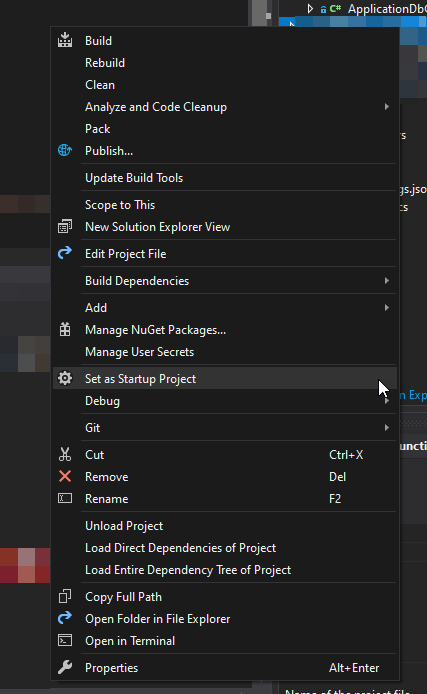 You can set it by clicking said project using the right mouse button and selecting "Set as Startup Project" - see below: