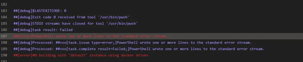 So the error code was 0, and the first "red line" (highlighting an error) in the whole log was "PowerShell wrote one or more lines to the standard error stream."