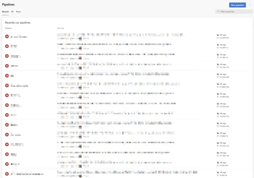 Another odd one for the books! No idea what caused it, but suddenly our pipelines started looking like this, with no clear reason (I mean, we break builds all the time... But all builds at once?)