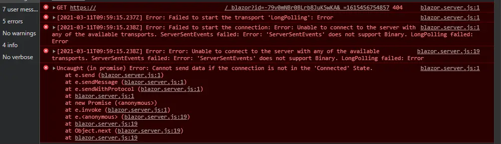 Error: Error: Unable to connect to the server with any of the available transports. ServerSentEvents failed: Error: 'ServerSentEvents' does not support Binary. LongPolling failed: Error.