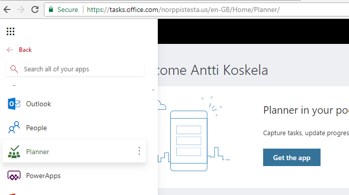 Selecting Planner from the waffle (see the custom domain in the URL!)