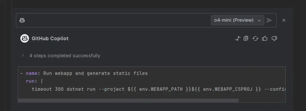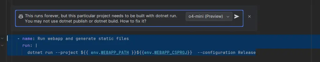 And while in the IDE, Copilot was just vehemently trying to convert me from using dotnet run to dotnet publish, on GitHub Actions, it had a lot of other ideas.