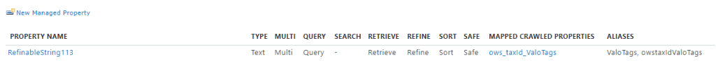 The settings could not be saved because of an internal error: The managed property "RefinableString113" can't have alias set to ValoTags, owstaxIdValoTags: The following invalid characters were used: ',', ' '.