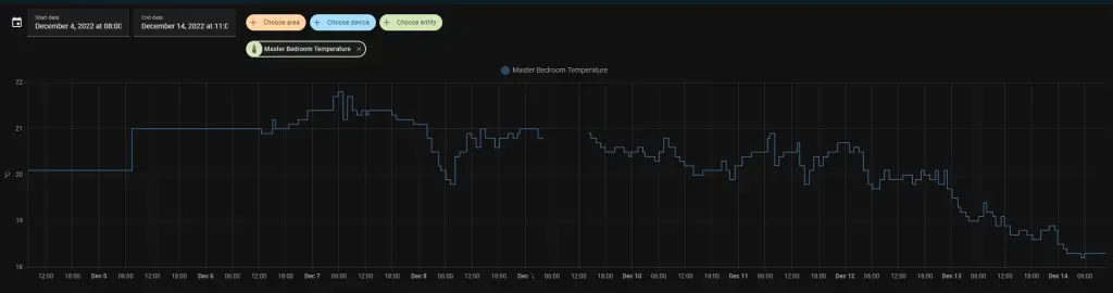 If you only sync occasionally, it doesn't get the whole history (hence, the data is not very granular), and if you enable continuous synchronization (like I'm doing with an extra tablet device I have at home - you can probably spot it from the graph below!), you'll get much more granular data, but no information about the room changing. You'll also need to have a device constantly able to connect to your devices - and it'll drain the battery from your device and your sensors quicker.
