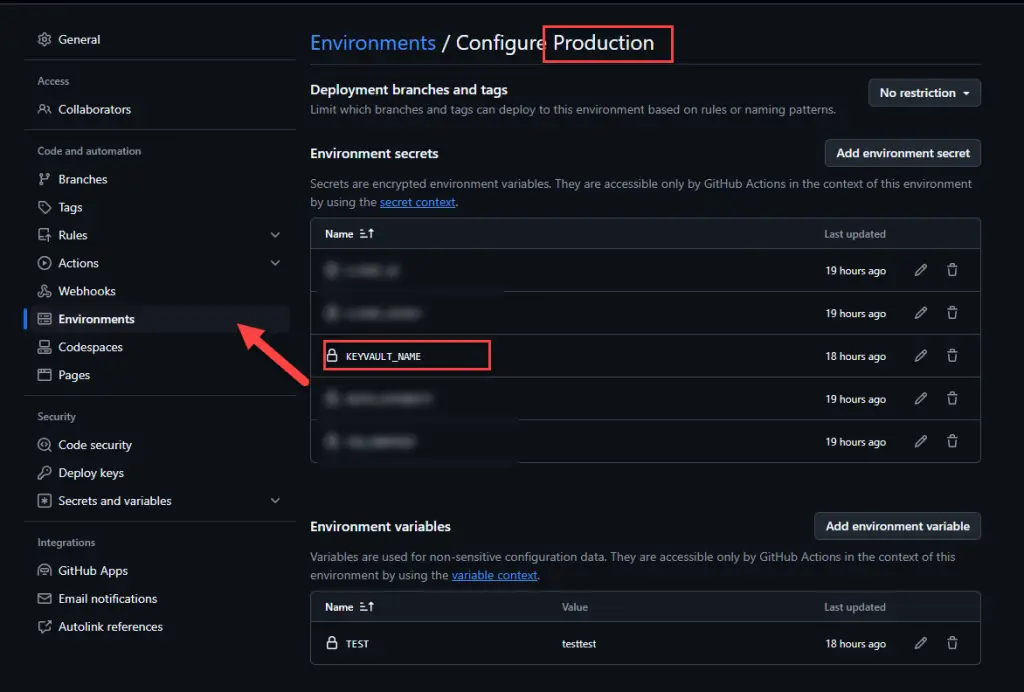 But take a look at the setup below for reference - it is for an environment called "Production", and the secret is called "KEYVAULT_NAME".