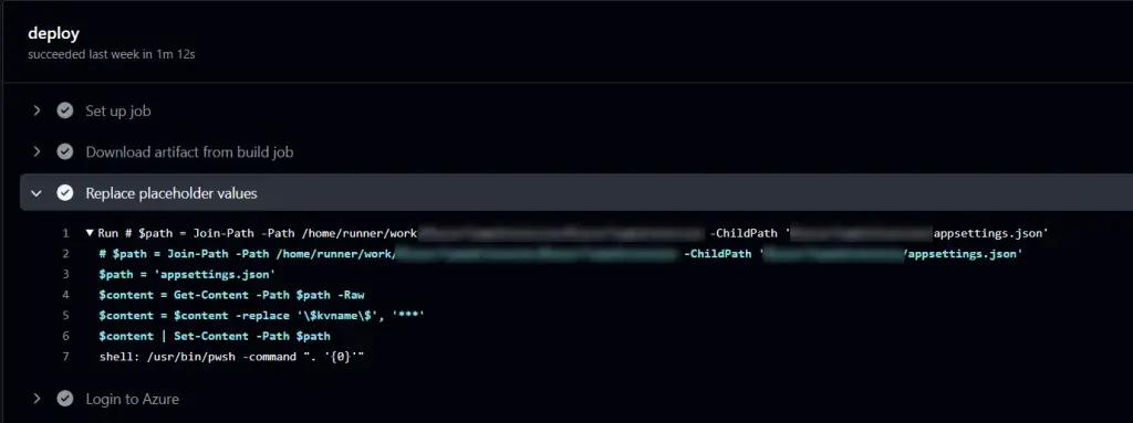 Like I said, I already knew, or at least thought I knew, what to do. I set up the repository secrets (despite the busy screenshot above, the UI is very straightforward) and decided to add a task to my pipeline for replacing an entry in my project's appsettings.json file. Namely, my key vault's name.