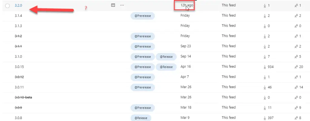 In the screenshot below, I can see versions 3.1.4 and 3.2.0 - but not 3.1.5, which I just published (as a hotfix to 3.1 branch, while maintaining 3.2 branch as-is) and wanted to access - but can't.