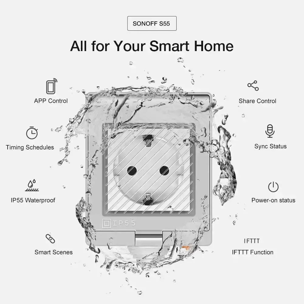 Sonoff is a brand by Chinese consumer electronics manufacturer, Itead. This outdoor socket from them is relatively inexpensive, feels quite well protected from the elements (although when in use, it's definitely not IP55 so please be smart when installing it!), provides integration with Home Assistant, and is easy to program using either HA or the eWelink app.