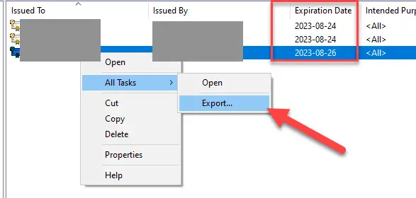 Select the CSR you want to export, click it with right mouse button > All Tasks > Export