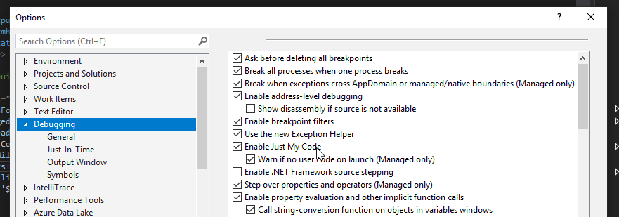 Alternatively, to avoid some edge cases with exceptions in libraries crashing your code before your breakpoints are hit, enable this setting as well:
