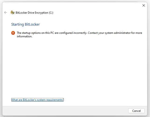 Well - I got in touch with my system administrator (because the link "What are BitLocker's system requirements?" not only takes you to a page defining requirements for Windows 10, not 11, but also doesn't explain the requirements) and he told me to make sure my primary hard drive is the first boot option.