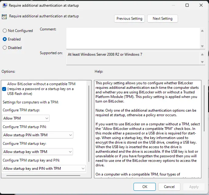 So in the picture below, enable "Require additional authentication at startup" with the following setup: