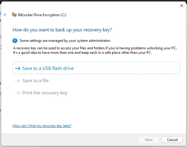 I had never seen this before, but the only way to store the recovery key was to save it to a USB drive. Printing was unavailable - which was incredibly odd - but also synchronizing it to Azure AD was disabled (although perhaps that's for the better, as you should never trust this to work and always have a local copy of the recovery key - which is something I found out the hard way!)