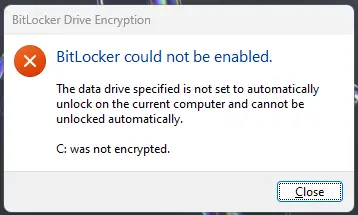 "BitLocker could not be enabled" - The data drive specified is not set to automatically unlock on the current computer and cannot be unlocked automatically. C: was not encrypted.