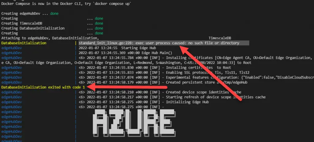 In my case, I was building a Docker container to initialize a TimescaleDB database in my local Azure IoT Edge simulator. But whenever my initialization container (DatabaseInitialization) would try and fire, it would fail and throw an error like this: