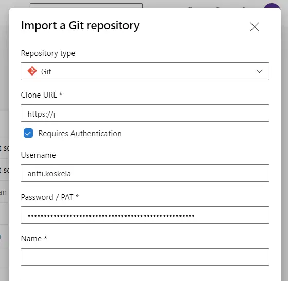 Select "Requires Authentication" as your git repo on Azure DevOps probably does require authentication. And then paste the credentials you stored earlier!