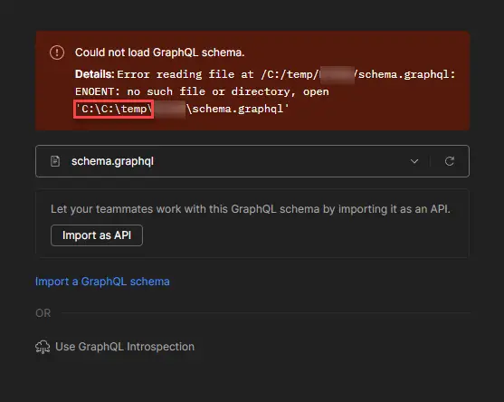 Details: Error reading file at /C:/temp/schema.graphql: ENOENT: no such file or directory, open 'C:\C:\temp\schema.graphql'