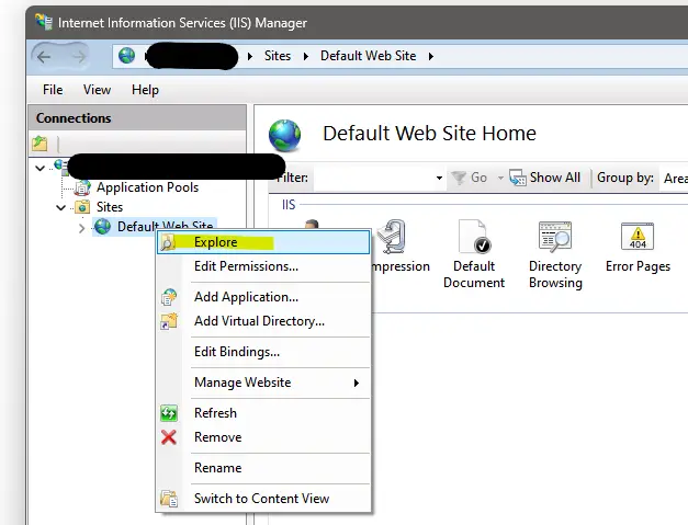 Now's the time to navigate to your Default Web Site's folder in Windows Explorer. You can access it easily like this: