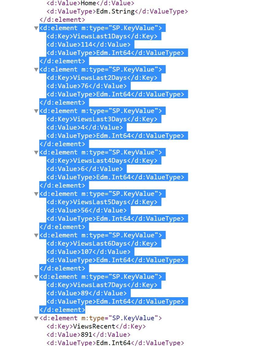 An excerpt of the results that SharePoint Search Service API returns. I've highlighted the Managed Properties for view counts.
