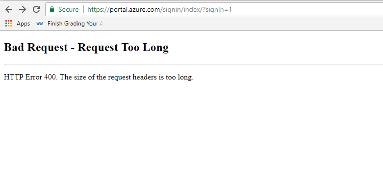Azure Portal throwing an error: "Bad Request - Request Too Long HTTP Error 400. The size of the request headers is too long."