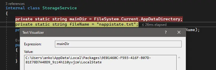 private static string mainDir = FileSystem.Current.AppDataDirectory; private static string fileName = "nappistate.txt"; private static string filePath = System.IO.Path.Combine(mainDir, fileName);