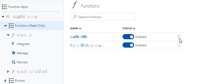 List of functions in an Azure Functions App... It's in read-only, so can't remove them.