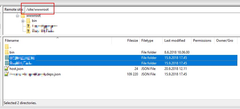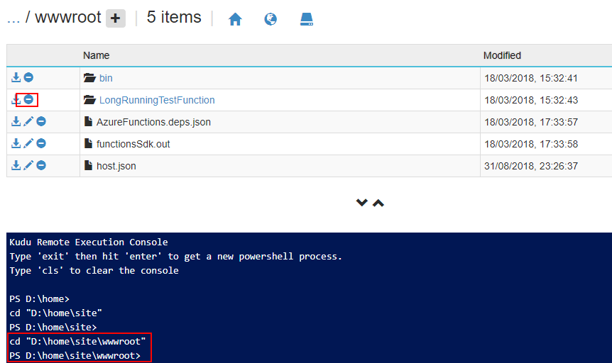 In the File Explorer and the PowerShell console below it you can traverse the site structure and modify it. Go ahead and change your directory (by clicking on folder names or by using the console) to \home\site\wwwroot. Now you should be in the directory with your Azure Functions - feel free to nuke them as you see fit! You can recognize them by their names, again, it's not necessary to remove the host.json and bin folders, although it shouldn't hurt either.