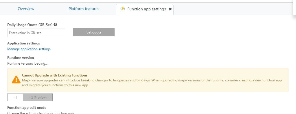 In the screenshot below, you can see how the page looks like when you have Azure Functions deployed: the "Runtime version" switch is disabled. It's worth noting, though, that it does show which version you have active, it's just not obvious: dark grey means you have selected that runtime version. Below, "~2" version has been selected.