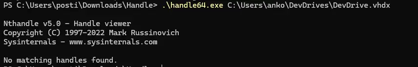 .\handle64.exe C:\Users\anko\DevDrives\DevDrive.vhdx