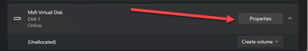Select your disk (it'll be called "Msft Virtual Disk" - but you might have multiple ones so be sure to select the right one) and click "Properties".