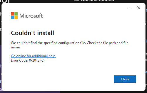 If instead of doing what I said (create a file called configuration.xml) you did what I did (modified the xml file that came with setup.exe), the xml file will be blocked.