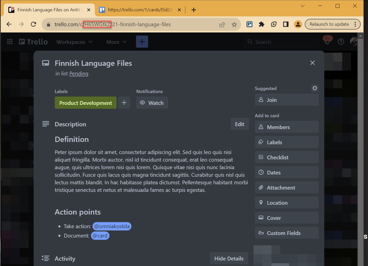 First, we'll need the id of your card. You might know this already, but you can grab it from the URL after the part that says /c/. In my sample below, card id is H65WGtkZ.