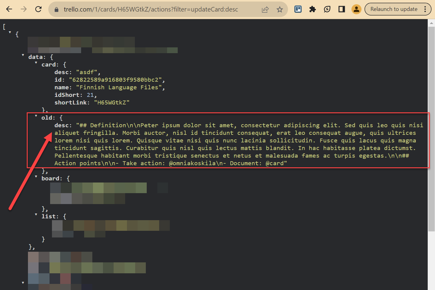 Now you can call the API with the id of the card. You can do this in the browser since you already have an active session - navigate to https://trello.com/1/cards/\[id\]/actions?filter=updateCard:desc to get your card's latest changes.