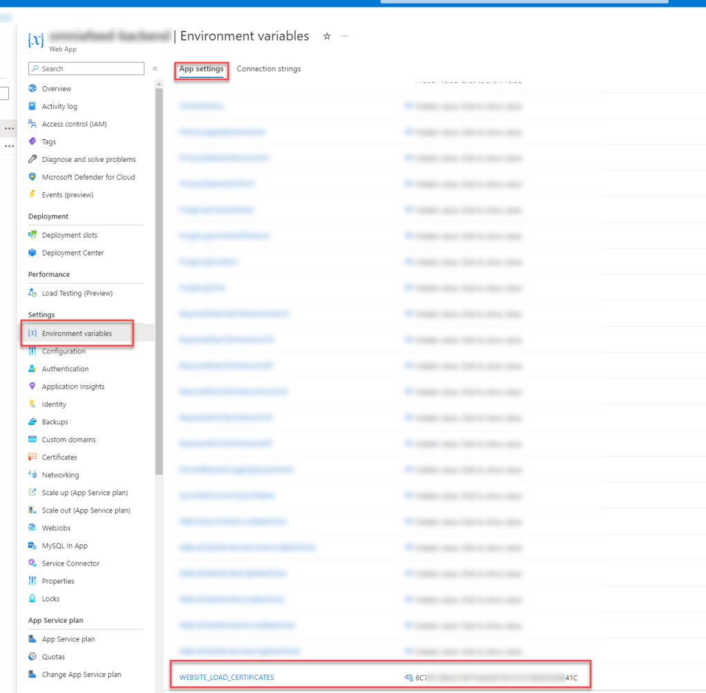 Make sure the certificate's Thumbprint is listed in the WEBSITE_LOAD_CERTIFICATES environment variable / app setting (either under Settings > Environment variables or web.config's