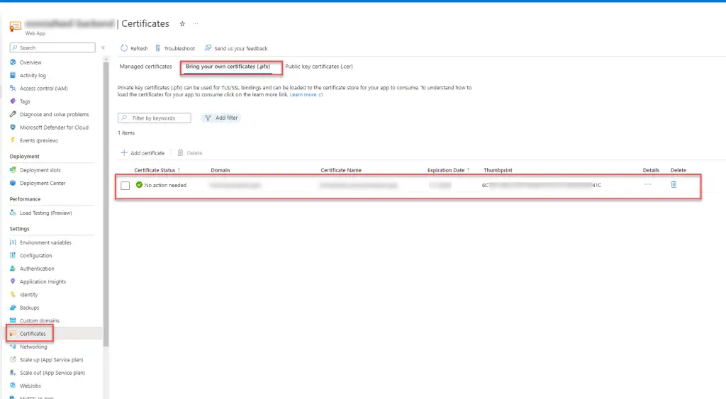 - 1. Upload your certificate (I uploaded a .pfx) and copy the Thumbprint