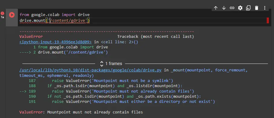 How to solve 'Mountpoint must either be a directory or not exist' in Google Colab workbook?