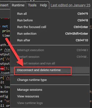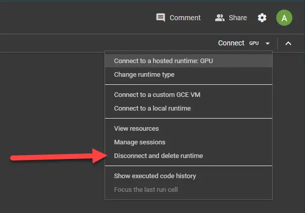 Or by clicking on "Runtime" and selecting, you guessed in, "Disconnect and delete runtime":