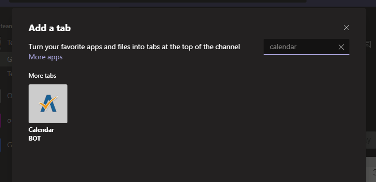 After that, you should be able to add a new tab with the name you specified for your app! You can do that either from the app listing or from the channel view of your team.