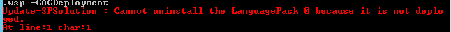 Have you ever run into this, very non-descriptive and weird SharePoint error message "Cannot uninstall the LanguagePack 0 because it is not deployed"? You could encounter it while running some PowerShell scripts - most typically when trying to update a wsp solution.