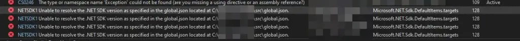 Then compare this with what you have in your global.json -file, and update it to a matching version (or install the version required in the file) if need be. Mine was: