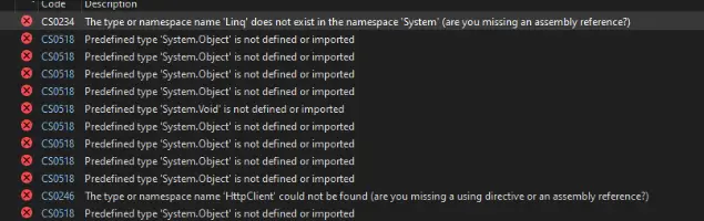 This article will explain how to fix an annoying situation, where Visual Studio fails to find any System types or other "basic" stuff you're pretty sure your project should have, automagically, out-of-the-box, without you doing anything. Stuff that comes with .NET. Stuff that should just work.