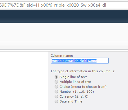 However, this will result in the internal name to be something like "Field_x0020_name_x0020__x002d__x". That's not super readable, but rather quite horrible to look at, or use anywhere at all. It mostly consists of dirtily encoded characters, automatically generated by SharePoint.