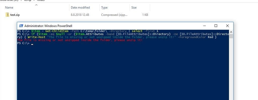 The next part will only run the code inside the IF-block if the item we have is not a directory. In this example, the whole block is just a Write-Host command with complaints about the lack of a folder.
