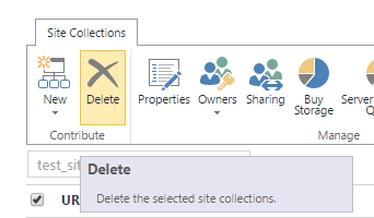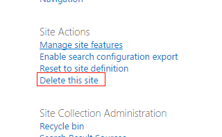 Sometimes you need to get rid of a site collection you've created in SharePoint Online. The most typical example perhaps is removing the team site created for a group of people working together. That's pretty simple and there are a few ways of doing that. For example, you might just go ahead, and delete the site from Site Settings (see below).