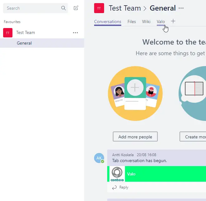 This is roughly what it looks like to have an extra tab (named Valo) for your channel. Apps are sideloaded per team (per group), but added per channel.