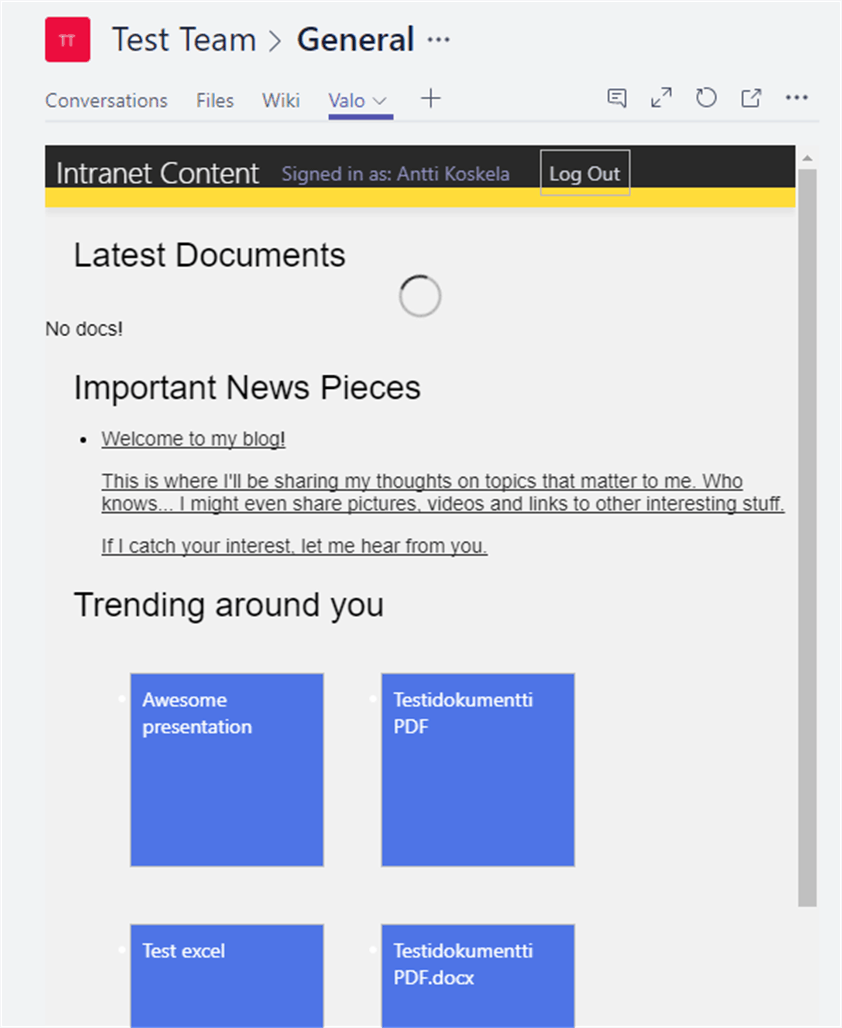 This tab is using (some of them) styles from SharePoint (black top bar mainly), it's authenticating against Azure AD, and then using Graph API to get the latest News, the latest documents (the library was empty) and showing the latest trending documents for the signed-in user.