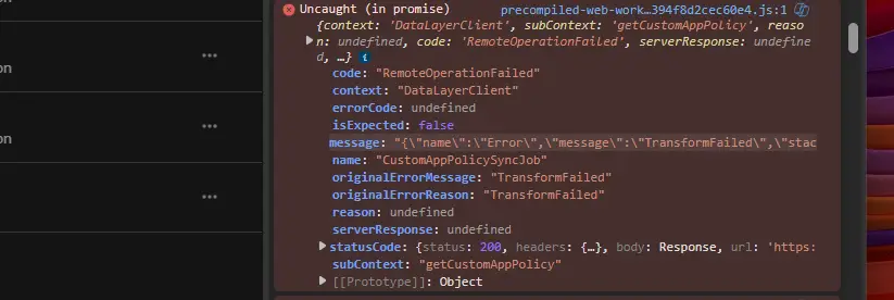 "message": "{\"name\":\"Error\",\"message\":\"TransformFailed\",\"stack\":[],\"reason\":\"TransformFailed\",\"serverResponse\":{\"status\":200,\"headers\":{\"access-control-expose-headers\":\"X-ServerRequestId\",\"cache-control\":\"no-cache, no-store\",\"content-encoding\":\"gzip\",\"content-type\":\"application/json; charset=utf-8\",\"date\":\"Sat, 12 Jul 2025 18:58:35 GMT\",\"strict-transport-security\":\"max-age=31536000; includeSubDomains\",\"vary\":\"Accept-Encoding\",\"x-cache\":\"CONFIG_NOCACHE\",\"x-envoy-upstream-service-time\":\"74\",\"x-machinename\":\"mtsvc000009\",\"x-msedge-ref\":\"Ref A: 23B50027B30A42189F7953E51A04FFA0 Ref B: HEL02EDGE0309 Ref C: 2025-07-12T18:58:36Z\",\"x-request-id\":\"ee3ebe88-b589-4f51-afe8-5abcc8b3c698\",\"x-serverrequestid\":\"23B50027B30A42189F7953E51A04FFA0\"},\"body\":{},\"url\":\"https://teams.microsoft.com/api/mt/emea/beta/me/settings/canManageLobApps\"},\"innerException\":{\"name\":\"Error\",\"message\":\"TransformFailed\",\"stack\":[],\"reason\":\"TransformFailed\"}}",