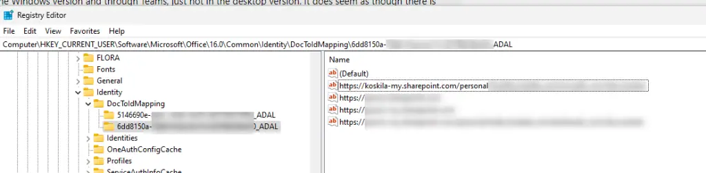Navigate to Computer\HKEY_CURRENT_USER\Software\Microsoft\Office\16.0\Common\Identity\DocToIdMapping