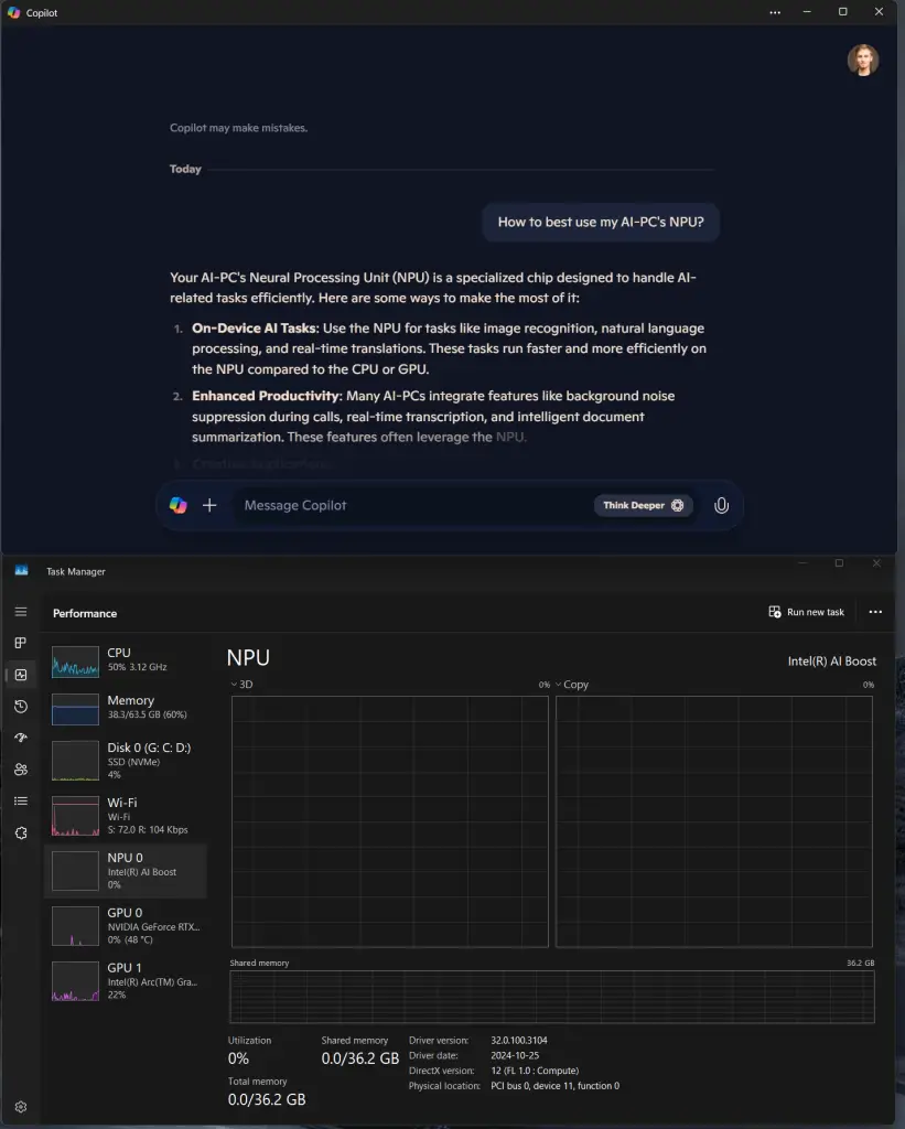 I wanted to check Copilot on some tips on how to use the NPU - and of course, check whether the "Copilot Native" app is using my NPU.